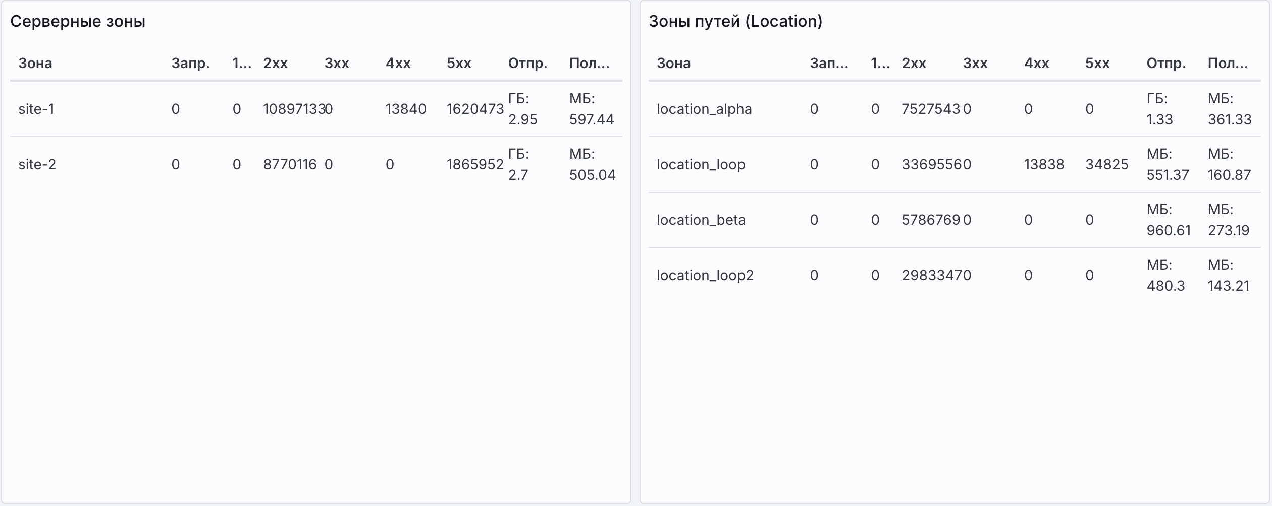 ЗапросыHTTP-ответы 1xx/2xx/3xxHTTP-ответы 4xx/5xxОтправленные данныеПолученные данныеУспешные SSL-рукопожатияНеудачные SSL-рукопожатияСерверные зоныЗоны путей (Location)Виджет "Зоны апстримов"#